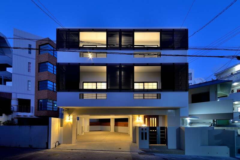 戸建住宅/アパート/マンション 2025.01.07 2017 ヴィラ大道 那覇市安里 那覇市大道に位置し、閑静な住宅地でありながら、おもろまち駅まで徒歩5分の距離。1階は車庫・ピロティと玄関のみです。2階は和風でも白木ではなく、山小屋風にダークな色合いでまとめています。3階は洋風で、白を基調にしました。独り暮らしの施主が、気分に応じて2階・3階を好きなように使い分けています。道路沿いのバルコニーは、ルーバーで囲われており、センターにはルーバーの引違いドアを設置。防犯上も安心して生活できるようになっています。